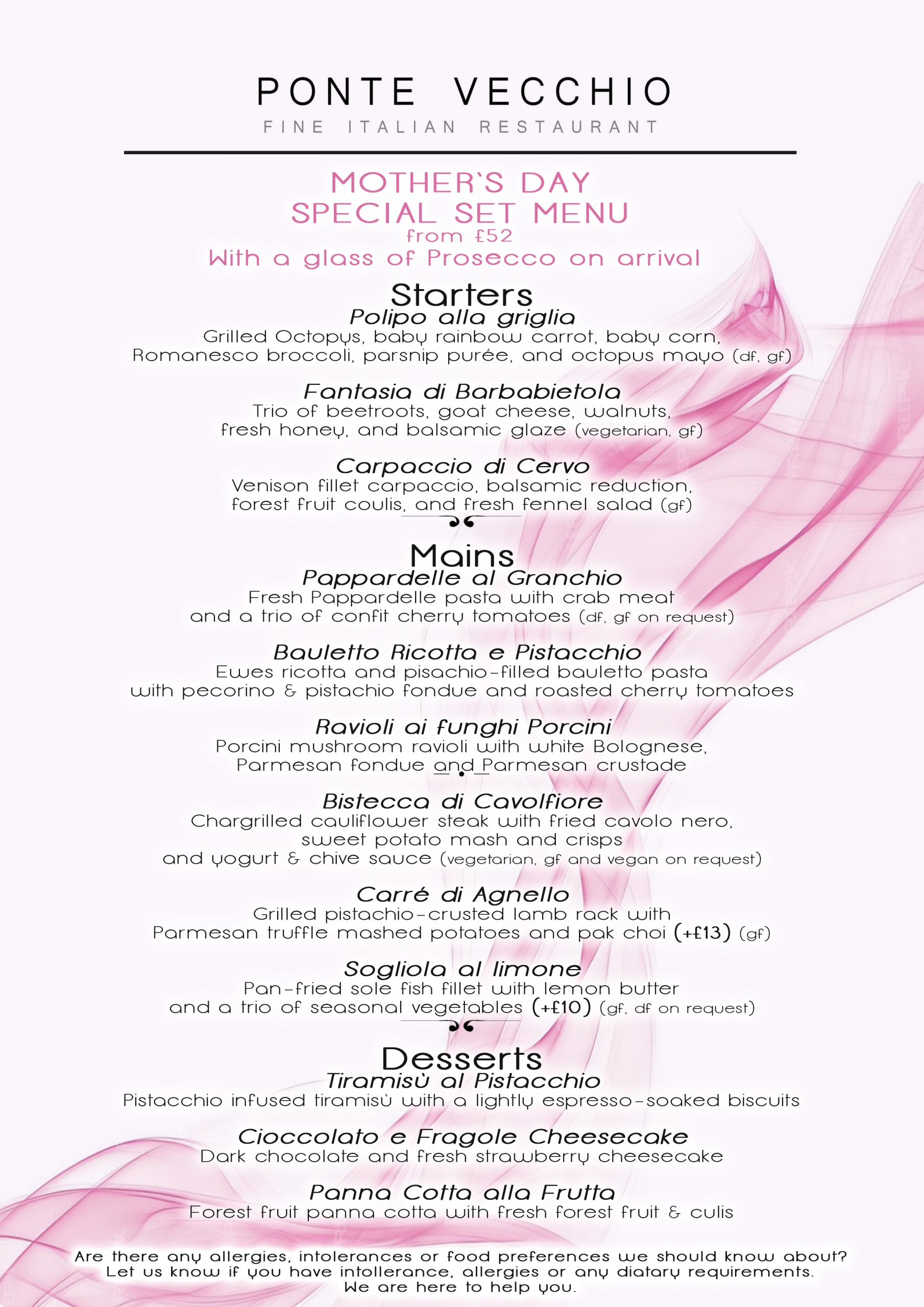 Make this Mother’s Day unforgettable at Ponte Vecchio, Bath’s most romantic Italian restaurant. Celebrate with a specially curated menu, fine wines, and stunning views of the River Avon and Pulteney Bridge. Whether it’s a relaxed lunch or an intimate evening meal, show Mum how much she means with authentic Italian dining in the heart of Bath.